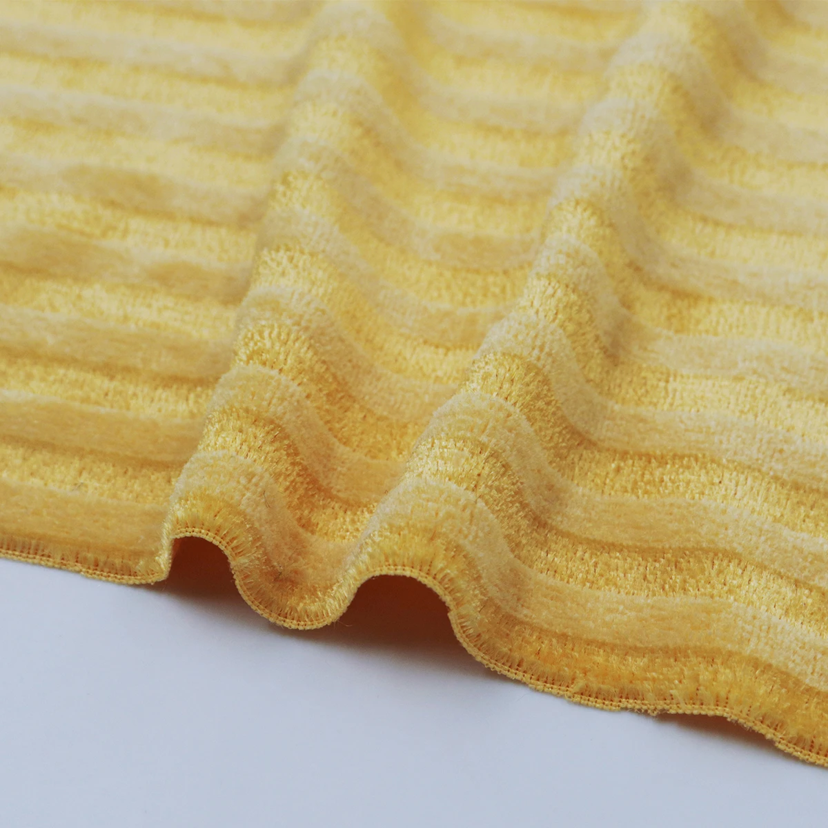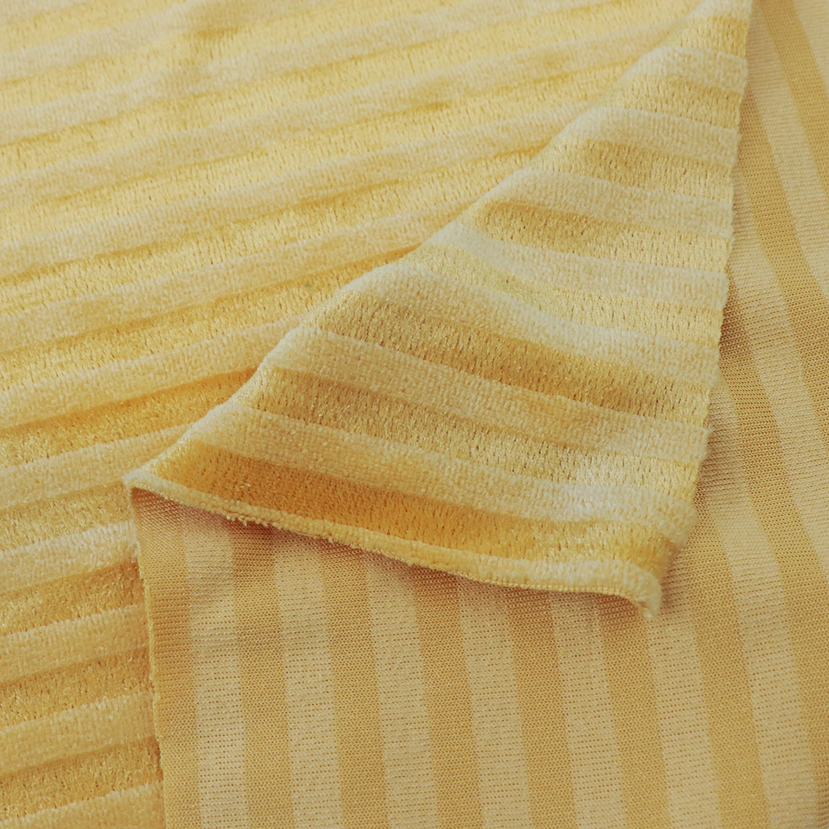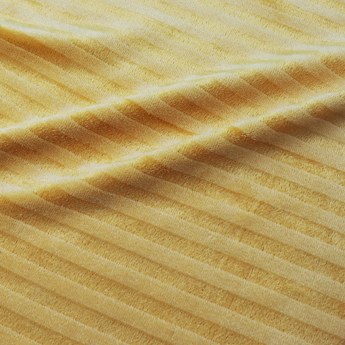 ผ้าร่องกลาง เนื้อกำมะหยี่ เนื้อผ้ามีลูกเล่นโดยการใช้เส้นด้าย 2 แบบ ทอสลับกันเพื่อให้เกิดความเงาและด้าน เนื้อผ้าเป็นโครงสร้าง Circular knit ทำให้มีความยืดหยุ่นในตัว ผิวสัมผัสมีความละมุน นุ่ม ขนไม่หลุด