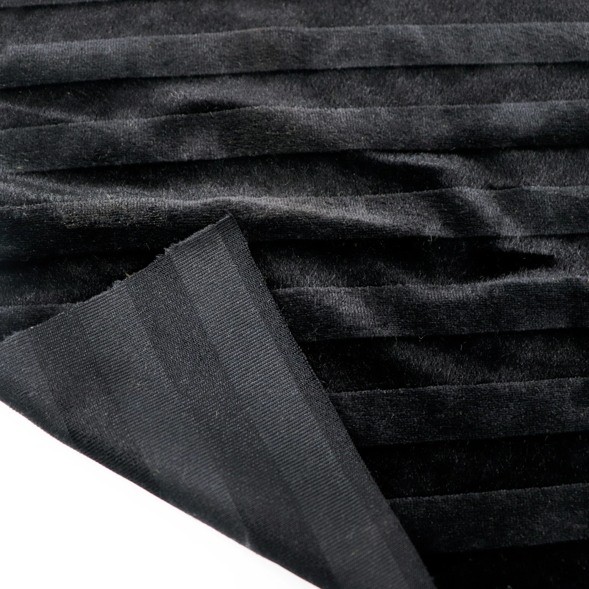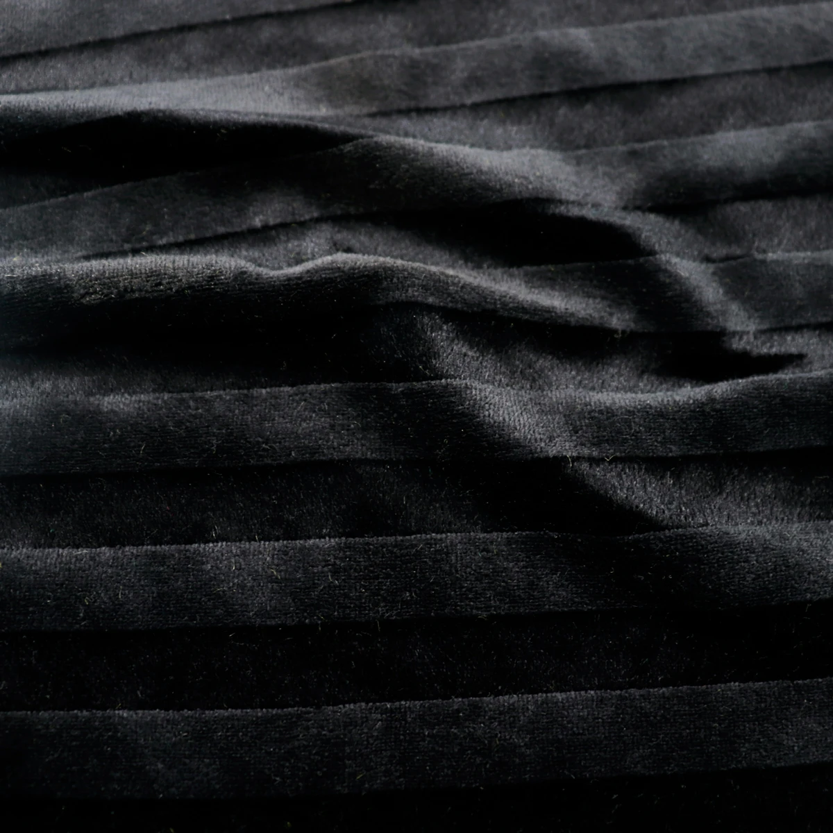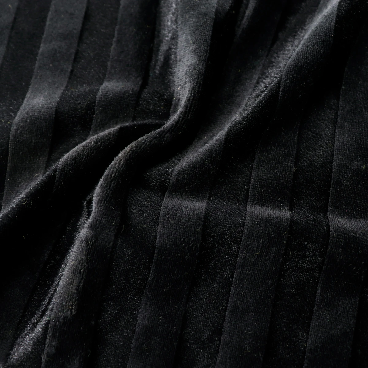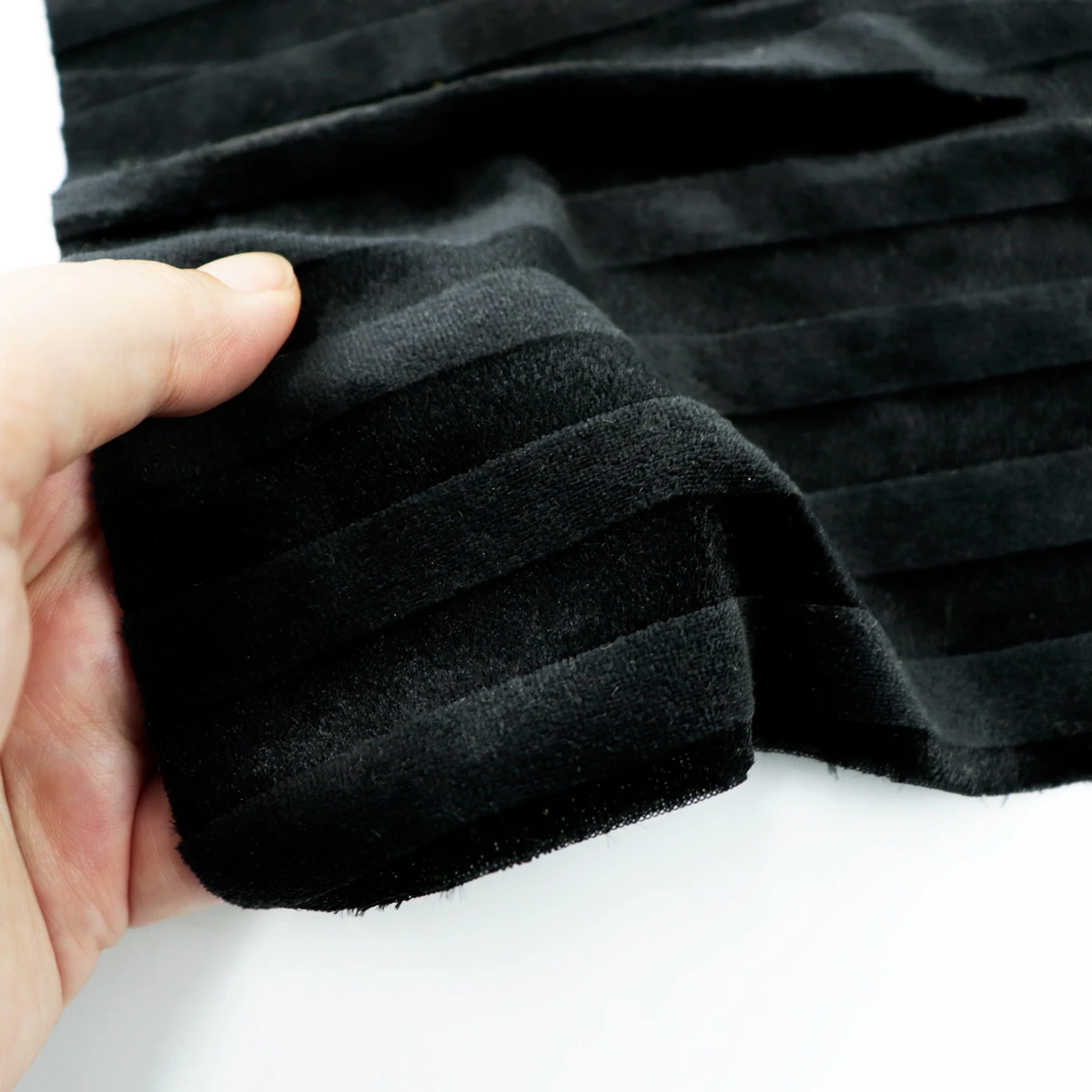 ผ้าร่องใหญ่ สีดำ เนื้อกำมะหยี่ เนื้อผ้ามีลูกเล่นโดยการใช้เส้นด้าย 2 แบบ ทอสลับกันเพื่อให้เกิดความเงาและด้าน เนื้อผ้าเป็นโครงสร้าง Circular knit ทำให้มีความยืดหยุ่นในตัว ผิวสัมผัสมีความละมุน นุ่ม ขนไม่หลุด ดูแลรักษาง่าย ซักเครื่องได้ สามารถนำมาทำ เสื้อ กางเกง แนวแฟชั่น หรือแม้กระทั่งผ้าตกแต่งเฟอร์นิเจอร์ สินค้าพรีเมี่ยมก็ทำได้ค่ะ